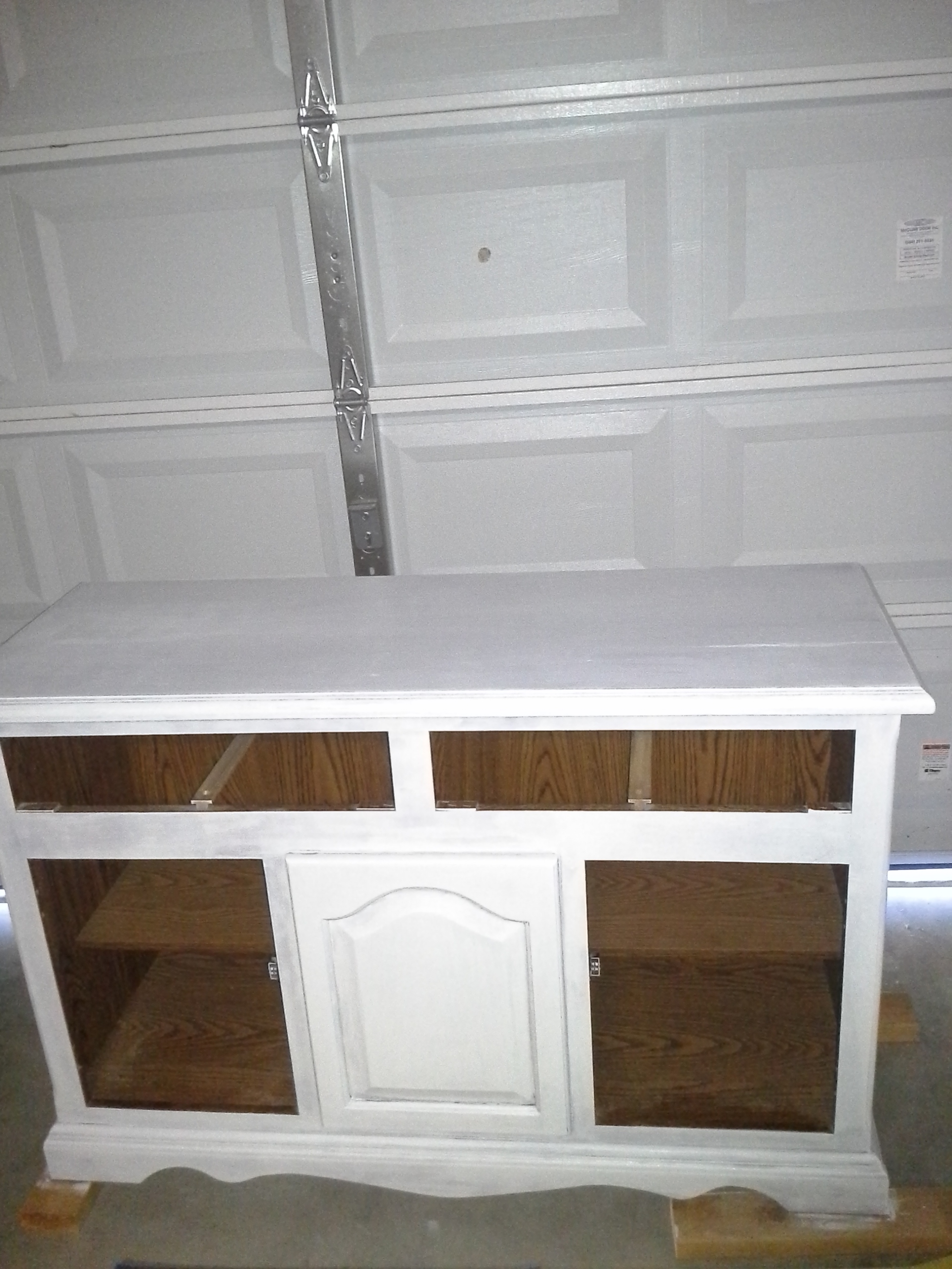 7- Now you just take your tarp off, put the  hardware on and then put doors and drawers back on! Ta da!! Thats it, its really simple and comes out looking great!!